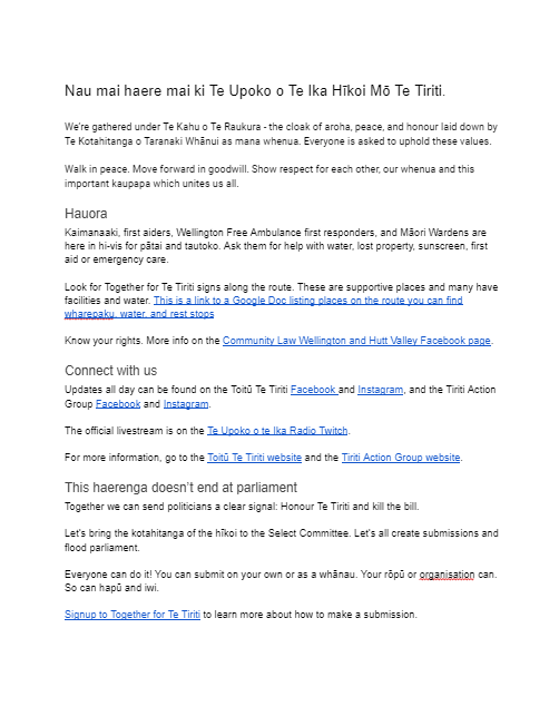 For all the details of the nationwide Hīkoi mō Te Tiriti, wider kaupapa, and mean kākahu, check and follow Toitū Te Tiriti